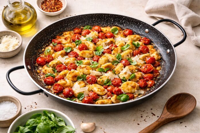 בימי מלחמה סוערים אלו, כאשר השגרה היומיומית מופרעת לעיתים קרובות על ידי אזעקות והצורך להגיע במהירות למרחב המוגן, רבים מחפשים פתרונות פשוטים ומהירים גם במטבח. דווקא ברגעים כאלה, אוכל חם ומנחם יכול להעניק תחושת בית ורוגע בתוך מציאות מתוחה. ניוקי, כיסוני תפוחי אדמה רכים המהווים פחמימה מנחמת ומשביעה, הם בסיס מושלם למנה ביתית שאפשר להכין בתוך דקות ספורות, וגם להפוך בקלות לארוחת צהריים מהירה לילדים או למבוגרים בין התרעות. במתכון הזה הניוקי נצרבים במחבת פאייה רחבה, המאפשרת פיזור אחיד והשחמה יפה של הכיסונים, אך ניתן להכין את המנה באותה קלות גם במחבת רגילה ורחבה. בזמן קצר מתקבלת מנה חמה, זהובה ומלאת טעם: הניוקי פריכים מבחוץ ורכים מבפנים, עגבניות השרי מתרככות ומתפוצצות קלות ויוצרות רוטב טבעי ומהיר, והכול מתחבר יחד עם חמאה, שום ושבבי פרמזן שמעניקים עומק טעמים עשיר.