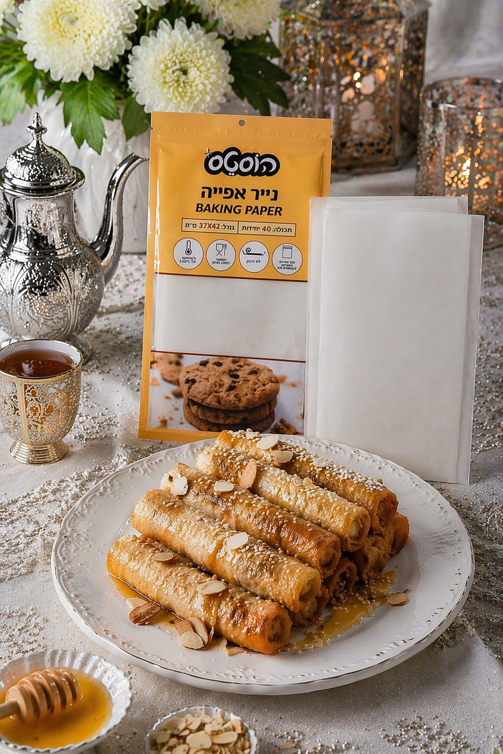 לצד השולחן העמוס מתוקים, דבש ואירוח פתוח, יש מקום גם למנות שמצליחות לשמור על האופי המסורתי, אך מגיעות בפרשנות מעט יותר מודרנית, נגישה ובעיקר נוחה לעבודה במטבח הביתי. סיגרי מופלטה במילוי קרם שקדים ודבש, המוצעים על ידי המותג הוסטס, מביאים את הטעמים המוכרים של המימונה בצורה מעט שונה. במקום הכנה והגשה מיידית של מופלטות אחת על השנייה, מדובר במנה שניתן להכין מראש, לאפות בתבנית אחת, ולהגיש בצורה מסודרת ואסתטית. השילוב בין מופלטה רכה, מילוי עדין וציפוי דבש יוצר קינוח חגיגי, נוח להגשה ומתאים לאירוח של מספר אנשים.