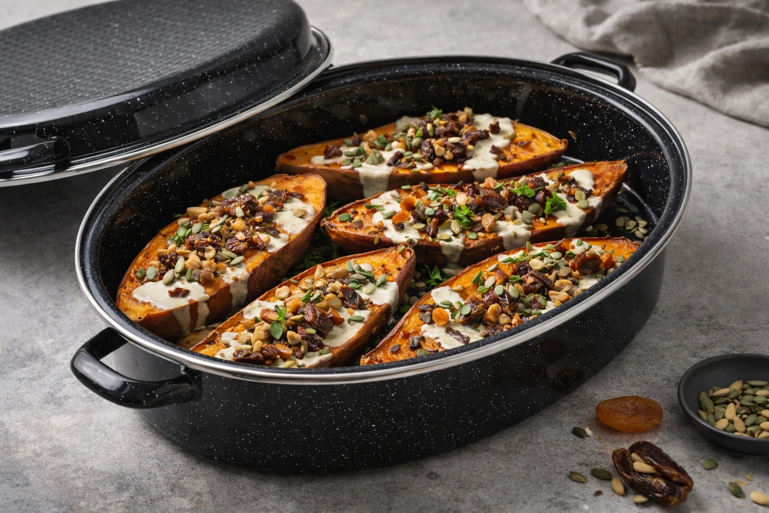 בטטות אפויות ברוסטר עם טחינה גולמית, גרעינים ופירות יבשים, באדיבות סולתם