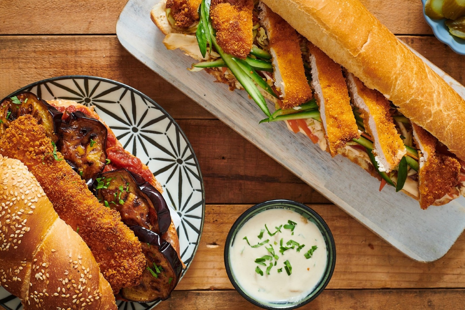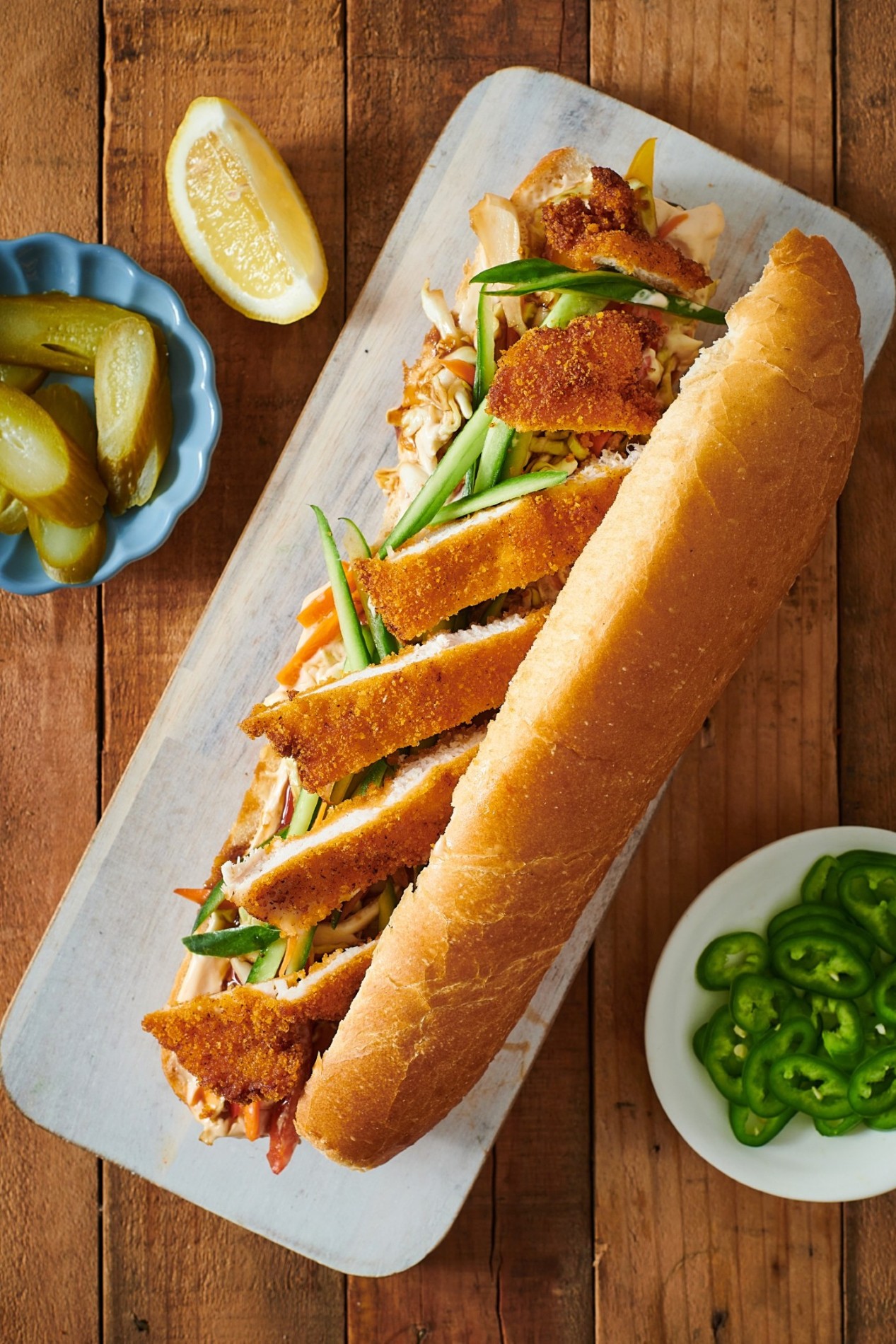 שניצל בבגט – בסגנון מוקפץ תאילנדי (עם רטבים אסייתים) – מערבבים בקערה רצועות של כרוב, גזר ופלפל עם טריאקי, מורחים את הבגט במיונז לחיץ ספייסי מאסטר שף וממלאים בירקות וברצועות שניצל + סריראצ'ה בסיום